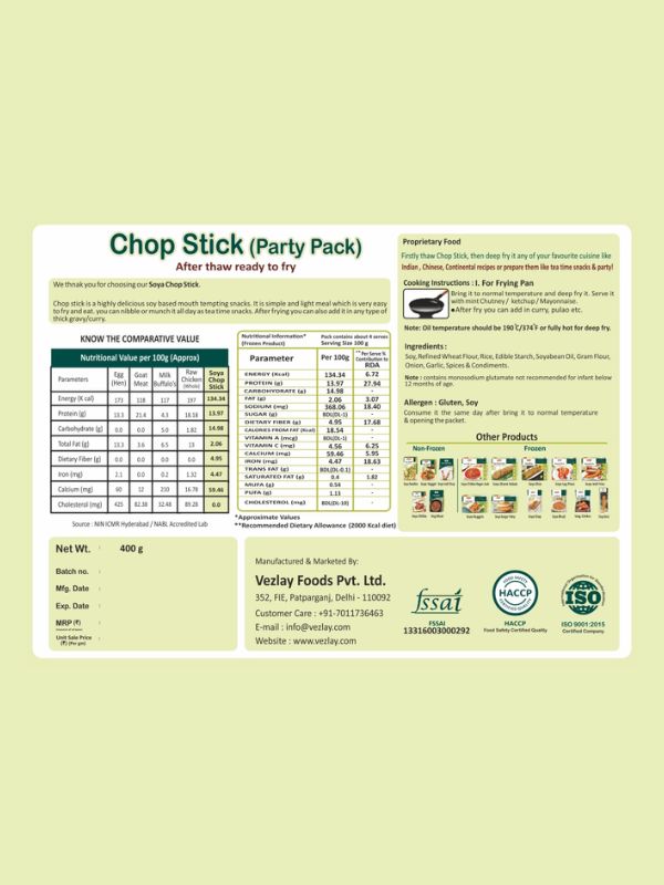 VezlayVezlay Chopstick (Party pack) are a quick, easy to prepare, and light supper. You may eat it as tea time snacks all day long or chew on it. This Vezlay Chopstick (Party pack) pack of 400 gm is tasty and healthy poducts which amount is only Rs. 475. Vezlay Chopstick (Party pack) are quick, easy to make and easy to make. You can eat it as a tea snack or chew it throughout the day. After opening it, bringing it to room temperature, and then frying it with a stick, you can also add it to curries. Serve it with mint chutney and enjoy the delicious taste. And you can eat this only by deep frying. Serve it with mint chutney, Tea, mayonnaise or ketchup. Vezlay Chop sticks, often referred to as soya chaap. These Chop Sticks are pure veg, yet they taste like chicken, and everyone can easily consume this because it is a vegan-friendly product and Plant Based protein.