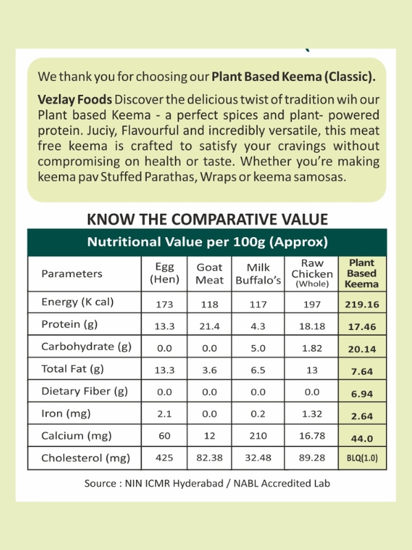 For Your Health: Vezlay Plant-Based Keema is naturally cholesterol-free and lower in saturated fats compared to meat-based alternatives. It’s an excellent source of plant protein that supports muscle health, energy levels, and overall wellness.